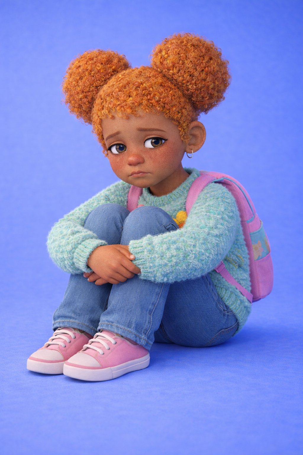 A friendly, stylized 3D illustration of a young girl with light brown skin and voluminous curly orange hair styled into two puff buns. She has soft freckles across her cheeks, warm expressive eyes, a small rounded nose, and a gentle, joyful presence. She is wearing a fuzzy mint-colored knit sweater with pink and yellow embroidered flower appliqués, classic blue jeans, and pink sneakers, along with a small pastel backpack.